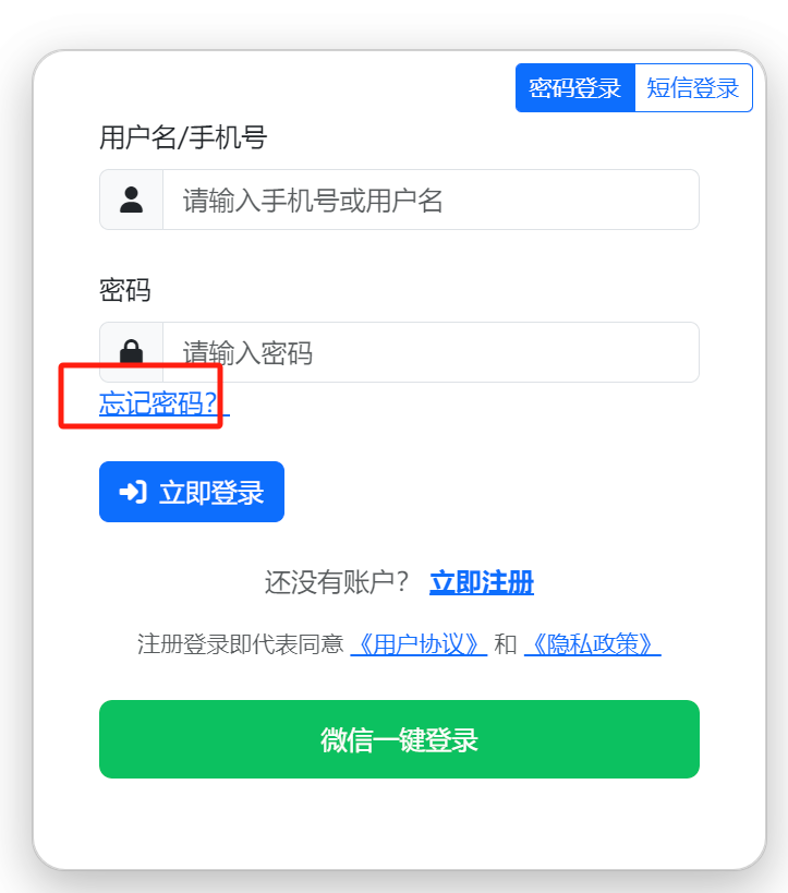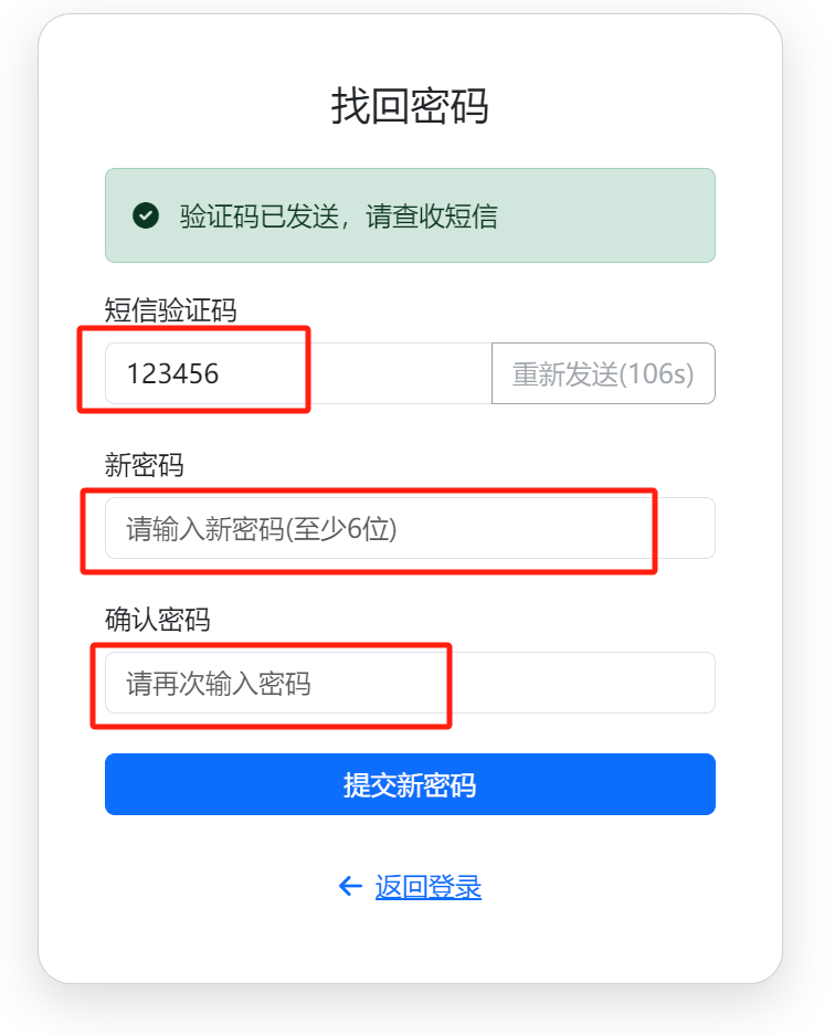 然后输入验证码和2次输入新密码,提交即可用手机号和新密码进行登录。