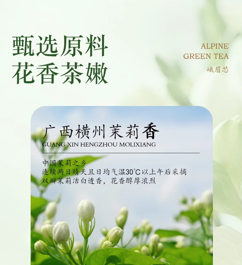 ◉采用广西横州中国茉莉之乡,连续两日晴天且日均气温30℃以上午后采摘。